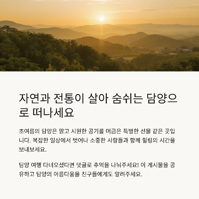 담양의 매력은 정말 말로 다 표현하기 어렵죠. 특히 6월에는 모든 풍경이 생동감 있게 살아나서 더 특별하게 느껴져요. 이번 글이 여러분의 여행 계획에 작은 도움이 되었길 바라며, 혹시 다녀오셨다면 어떤 곳이 가장 좋았는지 댓글로 꼭 공유해주세요!