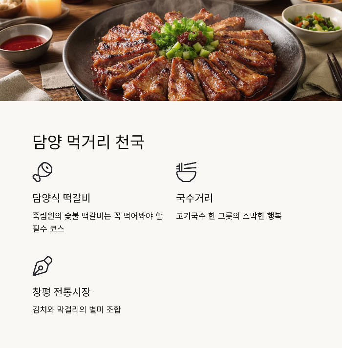 당연하죠! 떡갈비, 대통밥, 죽순요리 등 담양에서만 맛볼 수 있는 별미들이 가득해요. 식도락 여행지로도 딱이랍니다.