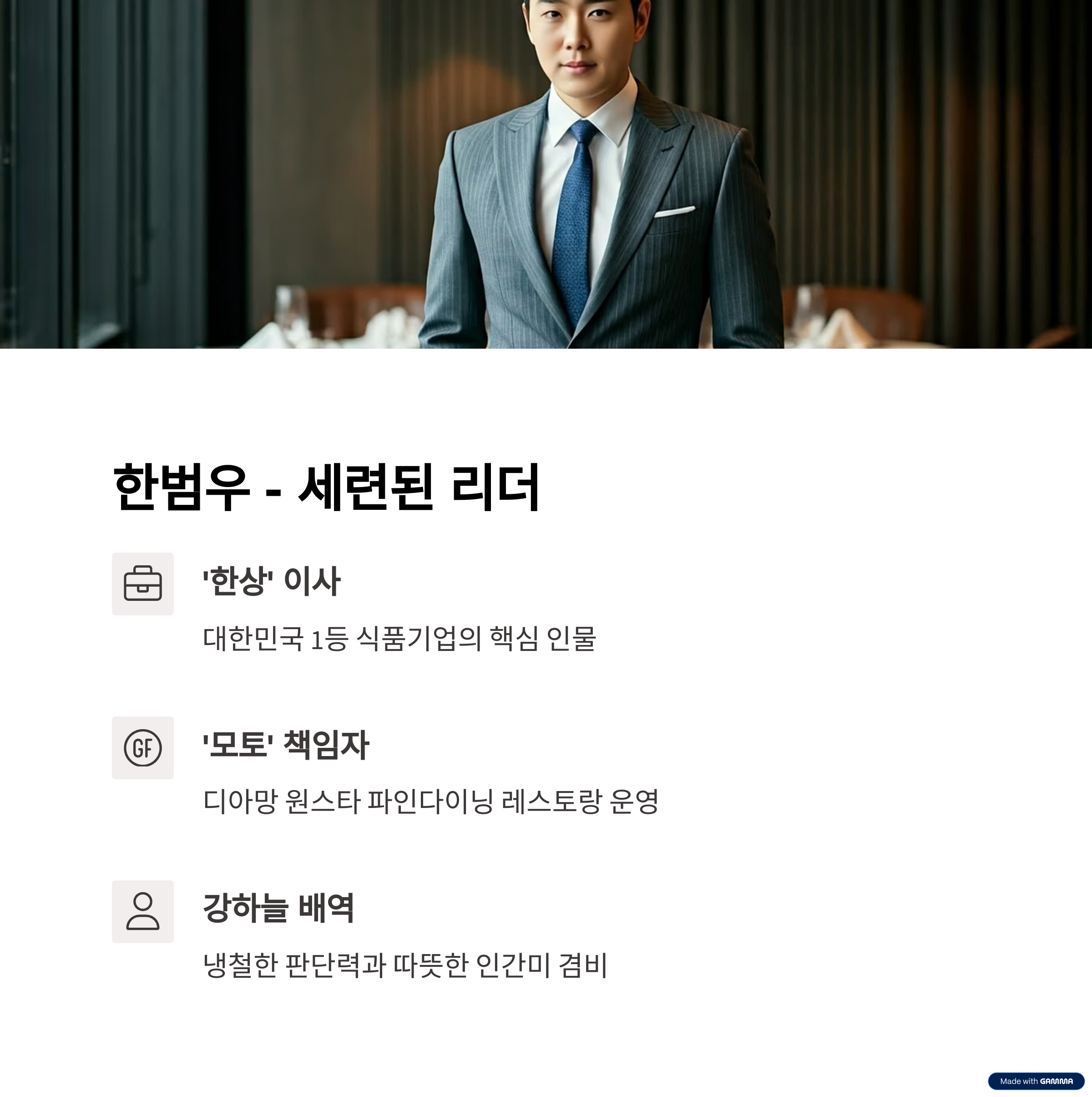 '한상'의 이사이자 레스토랑 '모토'의 운영을 책임지는 차분한 리더입니다.