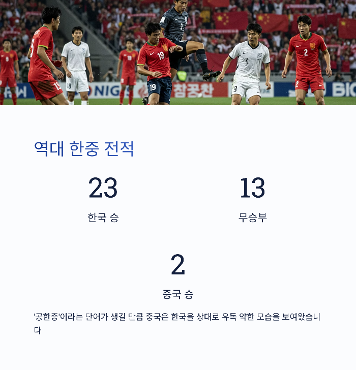 중국은 '공한증'이라는 단어가 생길 만큼 한국을 상대로 유독 약한 모습을 보여왔습니다. 특히 최근 경기에서도 한국이 이강인의 결승골로 승리하며 흐름을 이어가고 있어요. 하지만 스포츠는 예측불가! 방심은 절대 금물입니다.